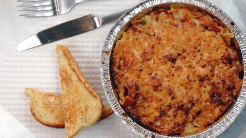 Lasagna, marinara sauce, green peppers, mushrooms, mozzarella cheese.